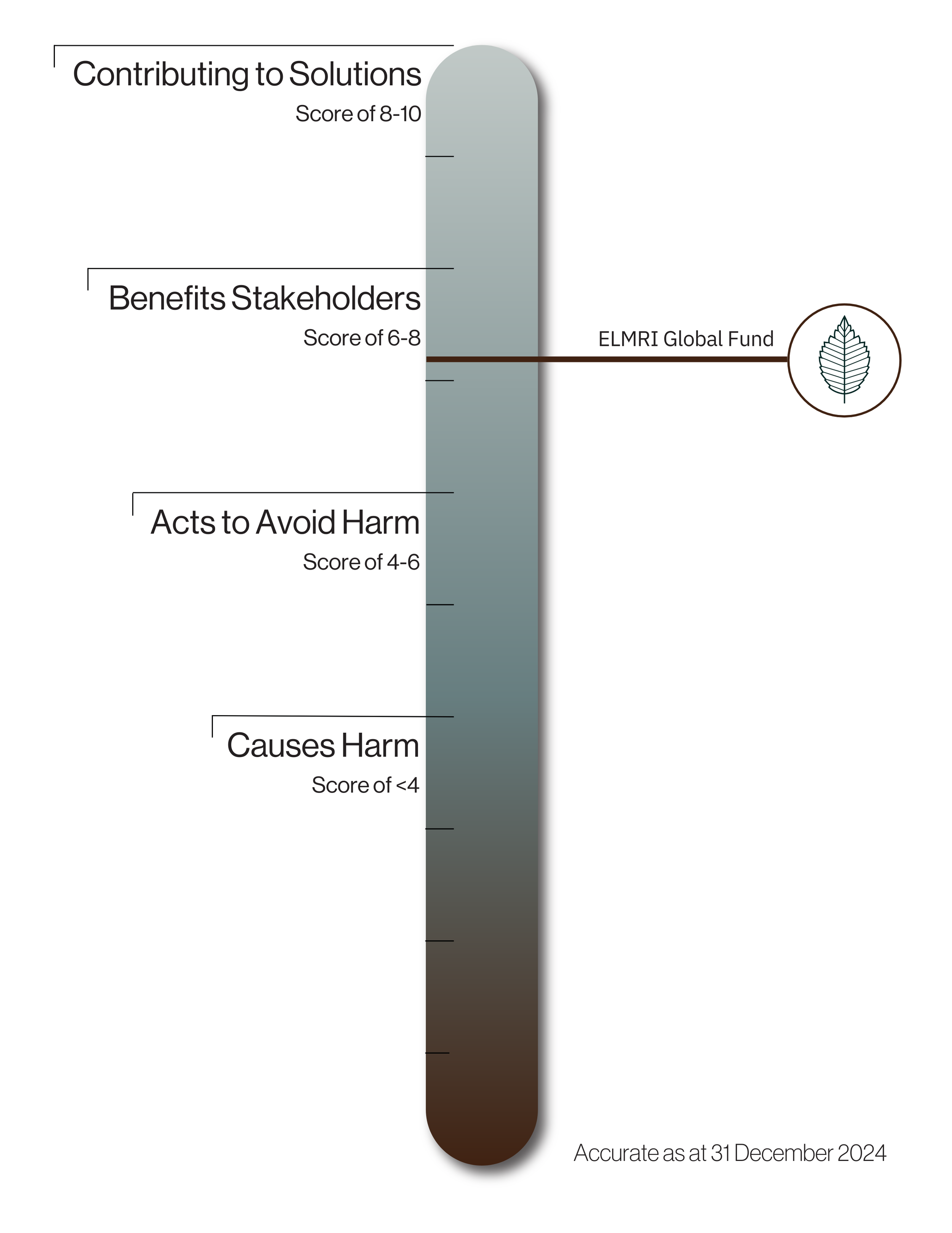 Our Portfolio Impact Score is produced by averaging the scores of every holding within the ELMRI Global Fund portfolio. While this inherently simplifies a huge amount of complex data into a single number, we believe it provides a useful ‘at-a-glance’ measurement of our authentic commitment to impactful investing. This score is updated quarterly in alignment with our Quarterly Holdings reporting.