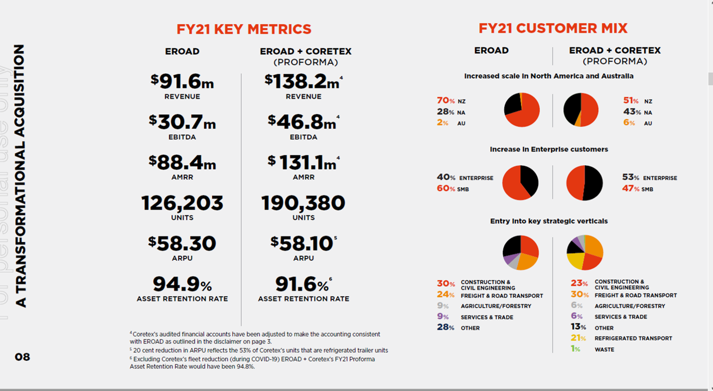 Eroad has struggled to grow in North America, adding only 390 units in the most recent quarter compared to 2,855 in New Zealand and 907 in Australia. Over the last 12 moths, the company has grown 5% in North America, 13% in New Zealand and 78% in Australia. Eroad has 35,437 installed units in North America and Coretex has 47,625 and so combining the two companies will bring scale benefits, but they will remain a minnow in the industry. The company also announced that a large North American customer with 1,700 units will not be renewing their contract due to them being acquired by another company. Furthermore although the company grew during the pandemic, they were negatively affected, and sustained lockdowns and restrictions will temper their growth in the near term.